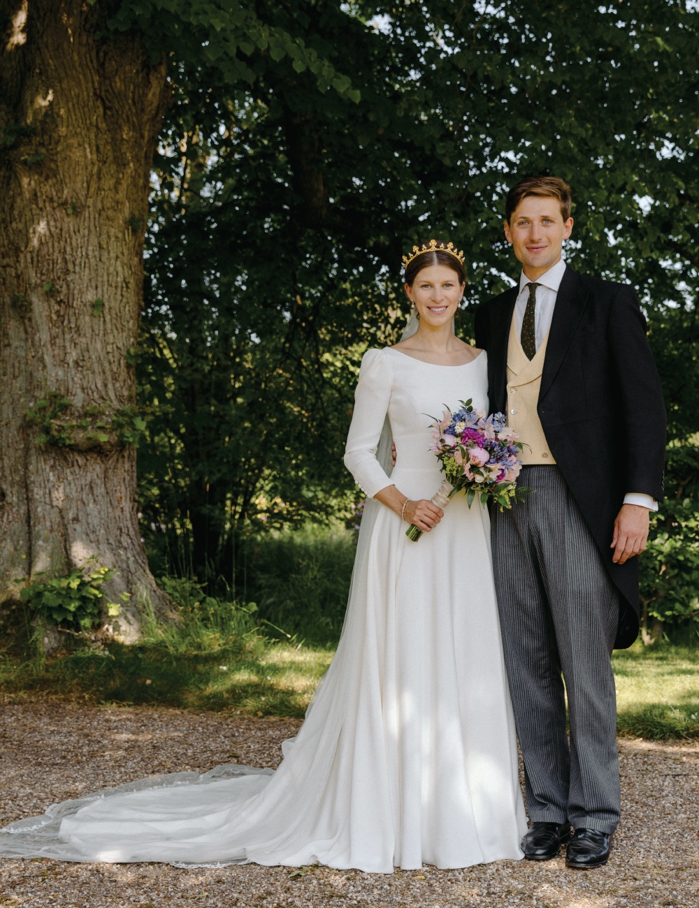 Wearing HALLEY BESPOKE constructed in ivory plain crepe with defining seamlines positioned under the bust and at the waist.